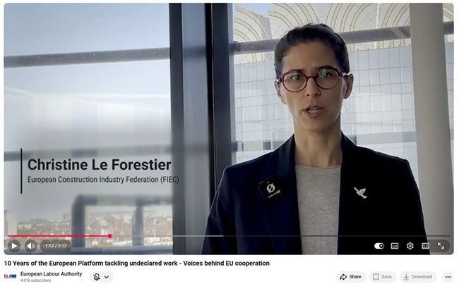 In this video (from '01:08) FIEC Director of Social Affairs, Christine Le Forestier, speaks as testimonial on the 10 years of the ELA EU platform tackling undeclared work, now a permanent Working Group at the authority.